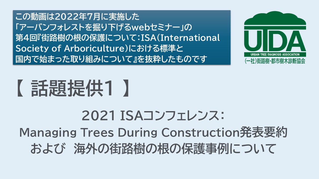 「アーバンフォレストを掘り下げるwebセミナー」の第4回『街路樹の根の保護について:ISA(International Society of Arboriculture)における標準と国内で始まった取り組みについて』(2022年7月実施)から、2つの動画を公開しました。